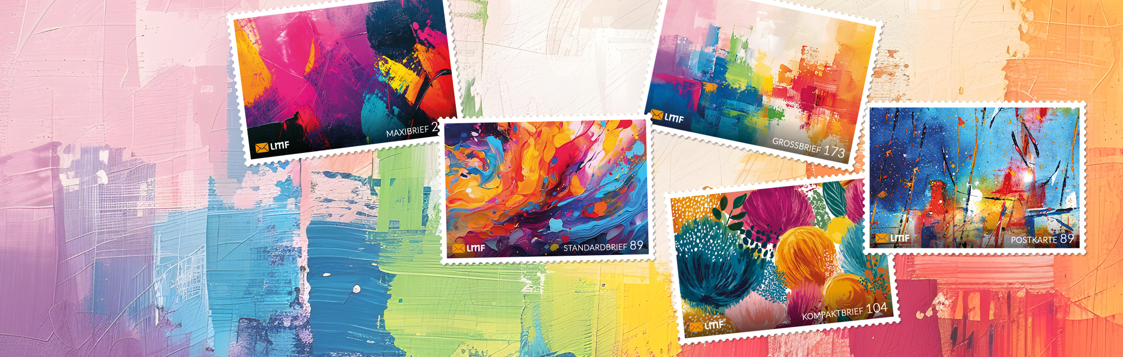 Mit der neuen Kunst Dauerserie erweitert LMF‑Postservice sein Markenportfolio um eine moderne Briefmarkenreihe, die farbstarke Akzente in der täglichen Kommunikation setzt. Die abstrakten Motive der fünf Wertstufen greifen verschiedene Stilrichtungen moderner Kunst auf und verbinden klare Farbflächen mit dynamischen Kompositionen.